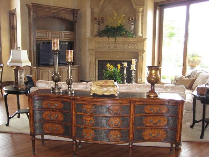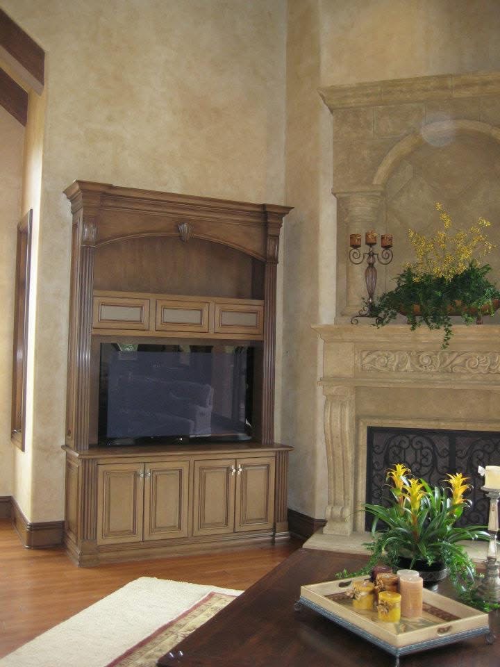 The walls throughout the home were finished in a soft, glazed Venetian plaster that captures the texture and warmth of a French country estate. The grand fireplace, originally gray precast concrete, was skillfully painted to emulate the subtle color variations of genuine French limestone.