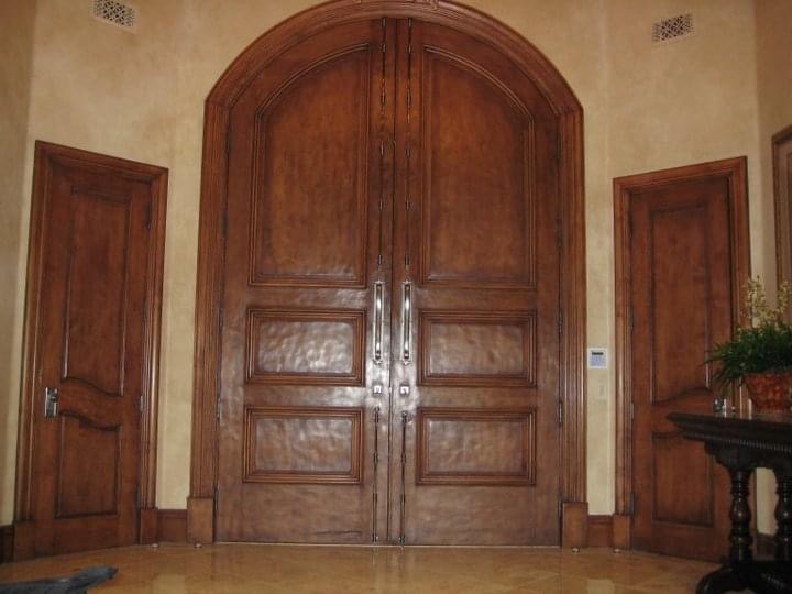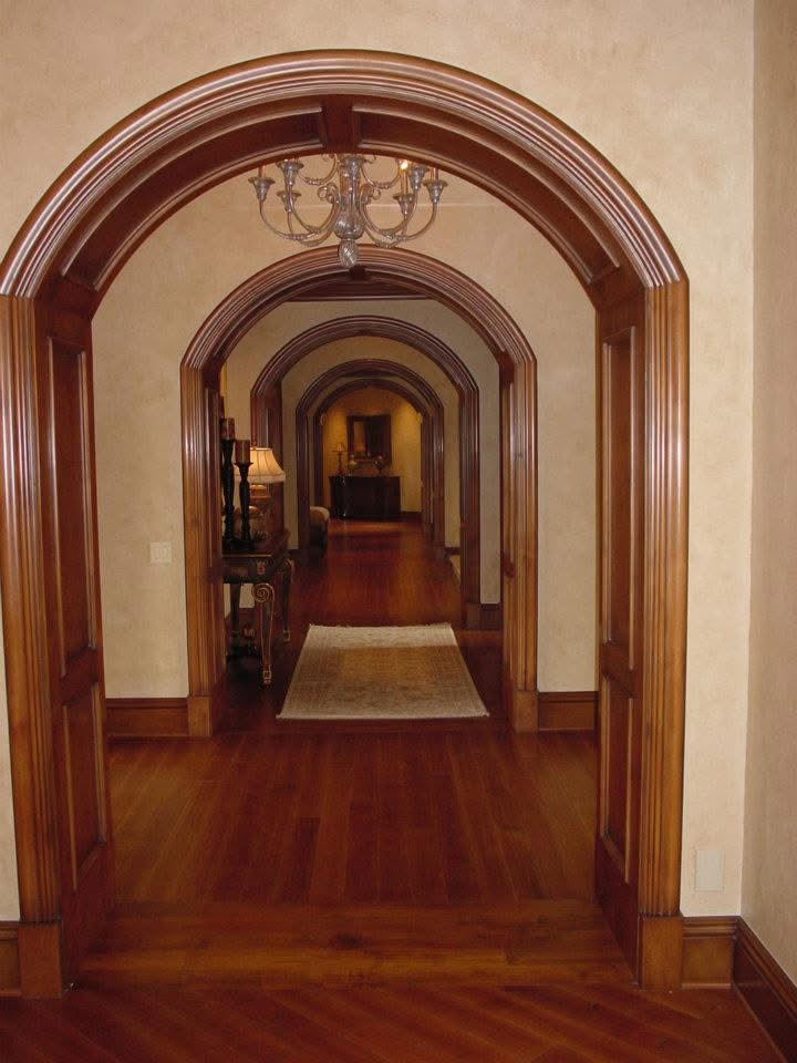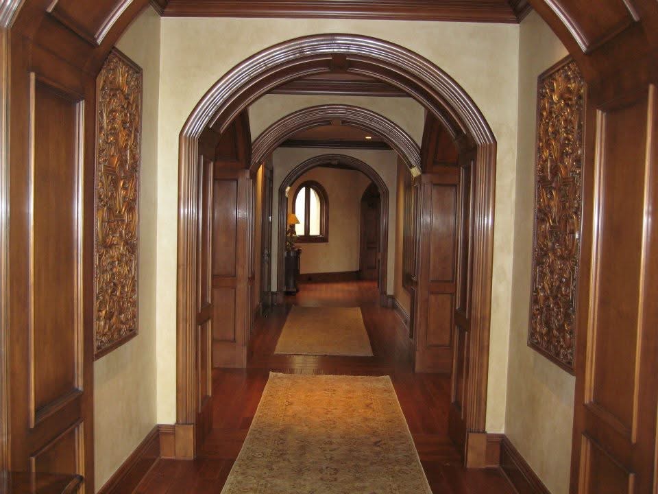 Inside, no detail was overlooked. Radius moldings surrounding doors, windows, arches, and ceilings were first sealed, then layered with stain, glaze, and wax before being hand-rubbed and French polished to a furniture-quality finish. Every surface—whether ceiling beam or baseboard—was finished by hand to achieve the authentic patina of a well-aged chateau.