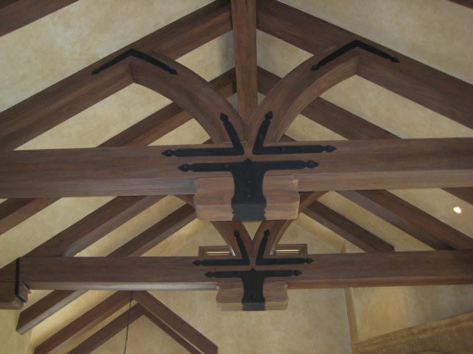 The Great Room’s impressive ceiling beams, crafted entirely from lightweight foam, were faux painted with a convincing woodgrain finish, blending seamlessly with the home’s old-world character.